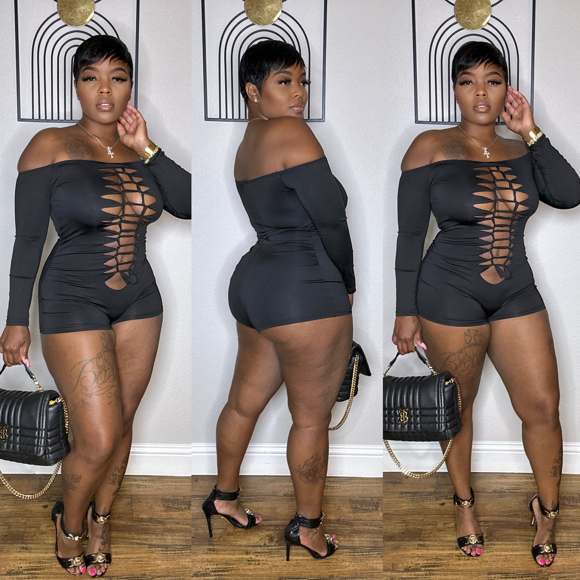 Very stretchy nylon romper. Model is wearing a medium.